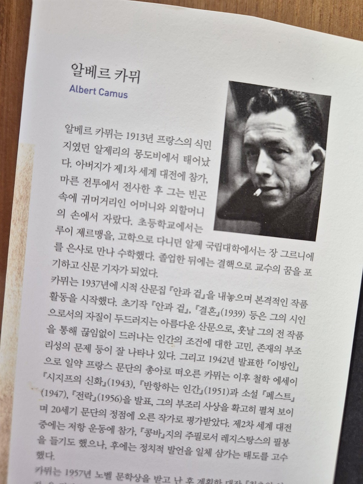 알베르 카뮈는 1913년 프랑스의 식민지였던 알제리에서 태어난다. 아버지가 제1차 세계대전에서 전사한 후, 빈곤 속에서 귀머거리인 어머니와 외할머니의 손에서 자랐다. 초등학교에서는 루이 제르맹을, 알제 국립대학에서는 장그르니에를 은사로 만나 수학했다. 졸업한 뒤에는 신문 기자가 되었다.